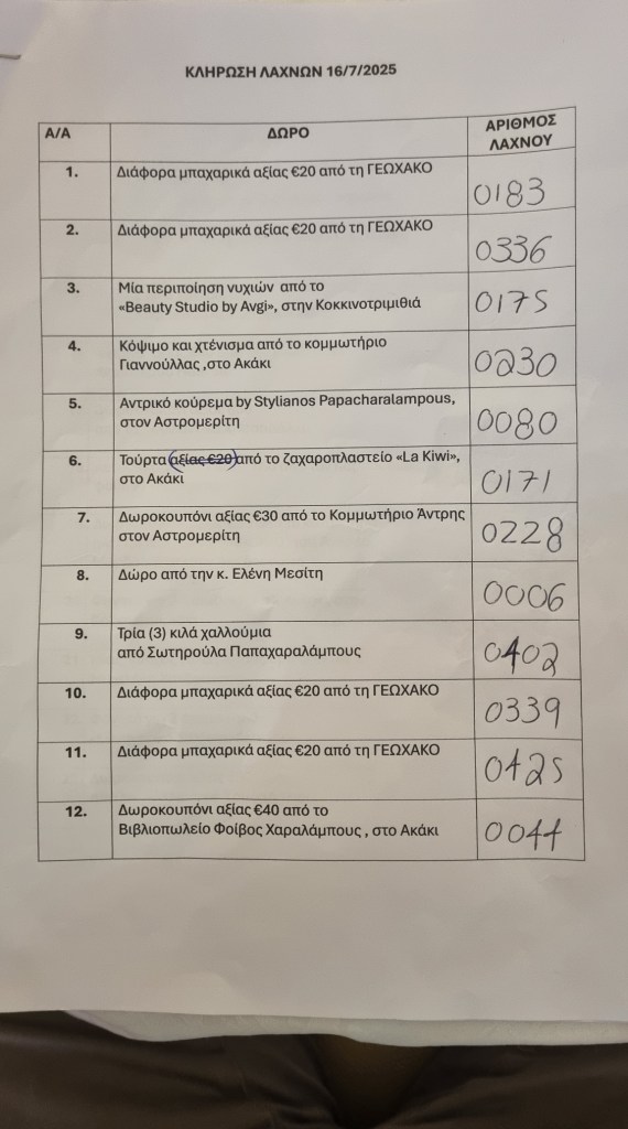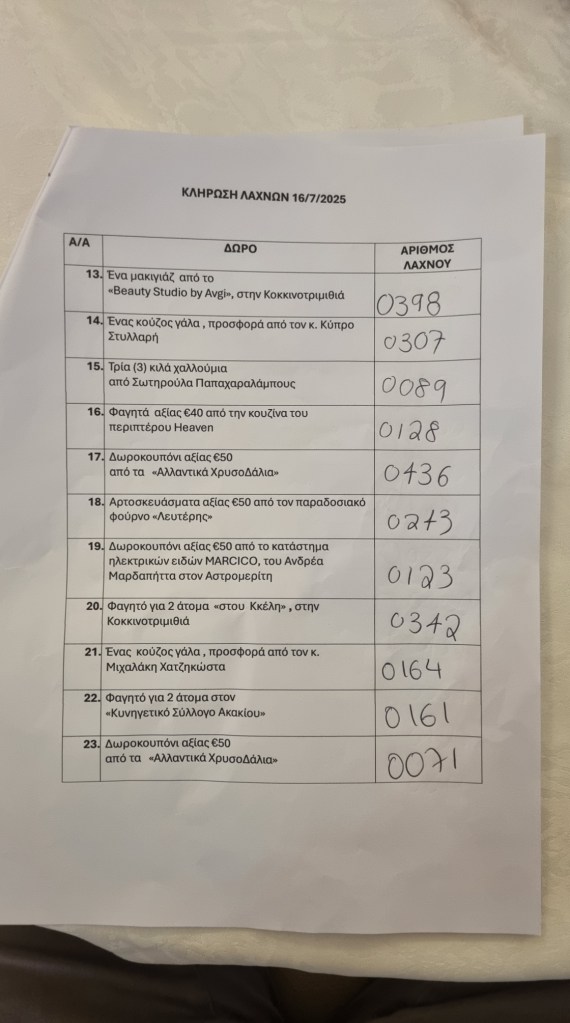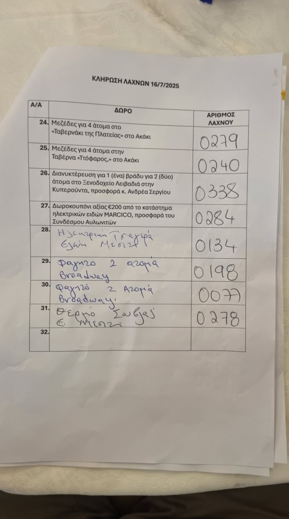Οι τυχεροί λαχνοί της χθεσινής κλήρωσης 16/7/2025 του Συνδέσμου Αυλωνιτών είναι οι πιο κάτω. Επικοινωνήστε στο τηλέφωνο 99307815 (Σωτηρούλα) για να παραλάβετε το δώρο σας.