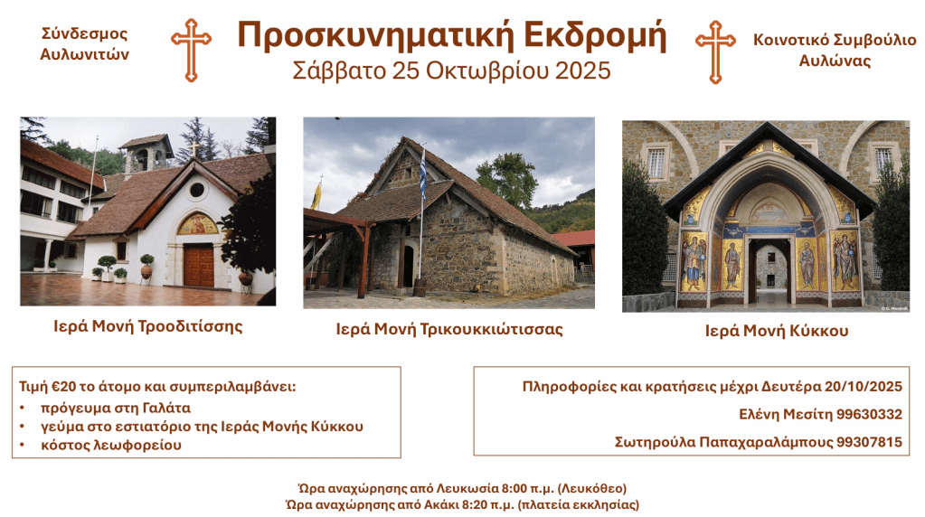 Ο Σύνδεσμος Αυλωνιτών σε συνεργασία με το Κοινοτικό Συμβούλιο Αυλώνας διοργανώνουν προσκυνηματική εκδρομή στις Ιερές Μονές Τροοδιτίσσης, Τρικουκκιώτισσας και Κύκκου, το Σάββατο 25 Οκτωβρίου 2025. Αναχώρηση από Λευκωσία 8:00 π.μ. και από Ακάκι 8:20 π.μ. Τιμή €20 ( πρόγευμα, γεύμα και κόστος λεωφορείου).Πληροφορίες και δηλώσεις Λένια 99630332 και Σωτηρούλα 99307815 μέχρι 20/10/2025.
